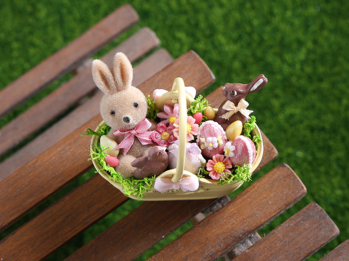 Miniature Spring Garden Basket with Flocked Bunny, Chocolates and Easter Eggs  – 1/12 Scale