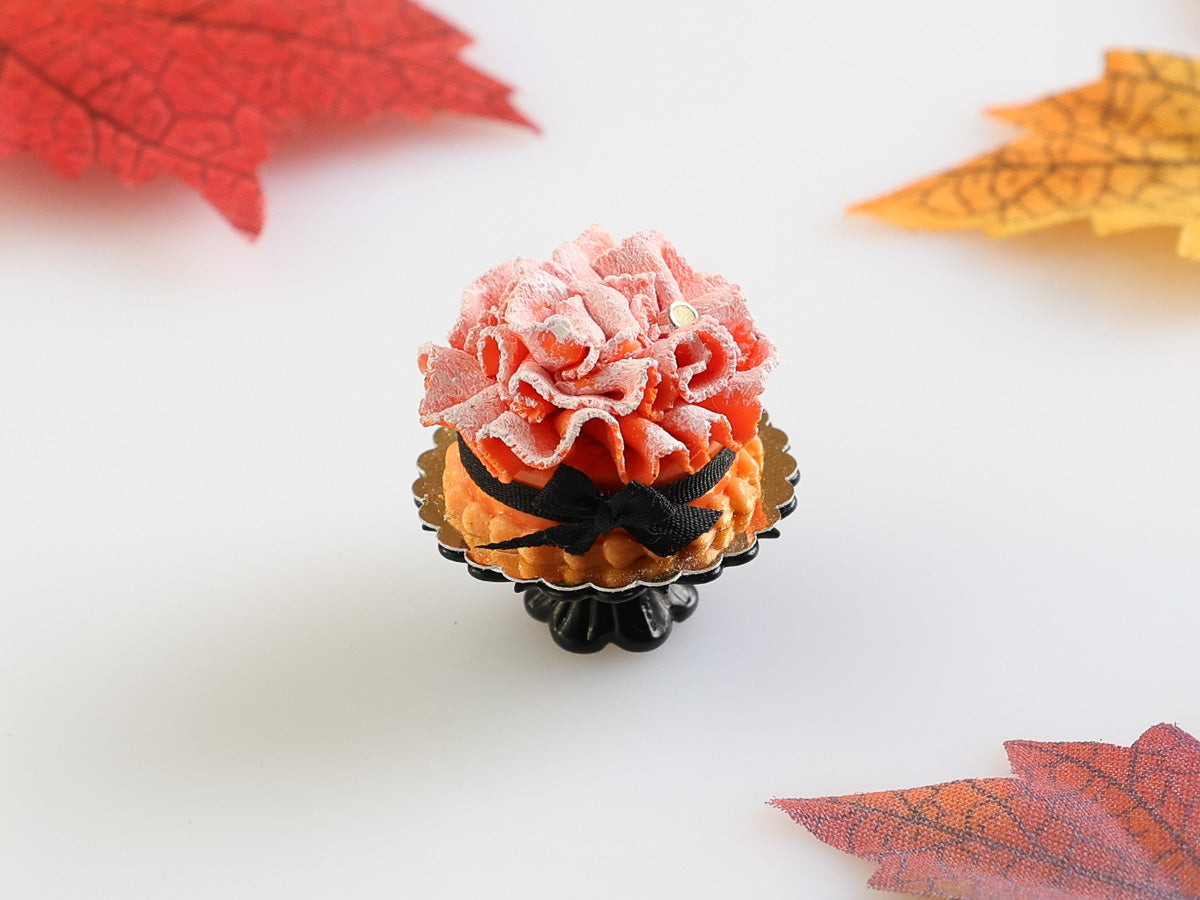 A beautiful handmade 1:12 scale autumn ruffle cake decorated with a black silk bow. the perfect dollhouse accessory for your fall décor or miniature bakery scene!
