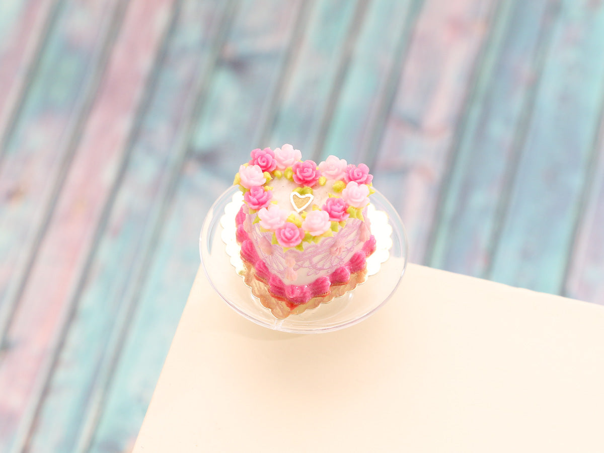 A heart shaped cake decorated with tiny roses in dark and light pink, leaves and hand-piped details.