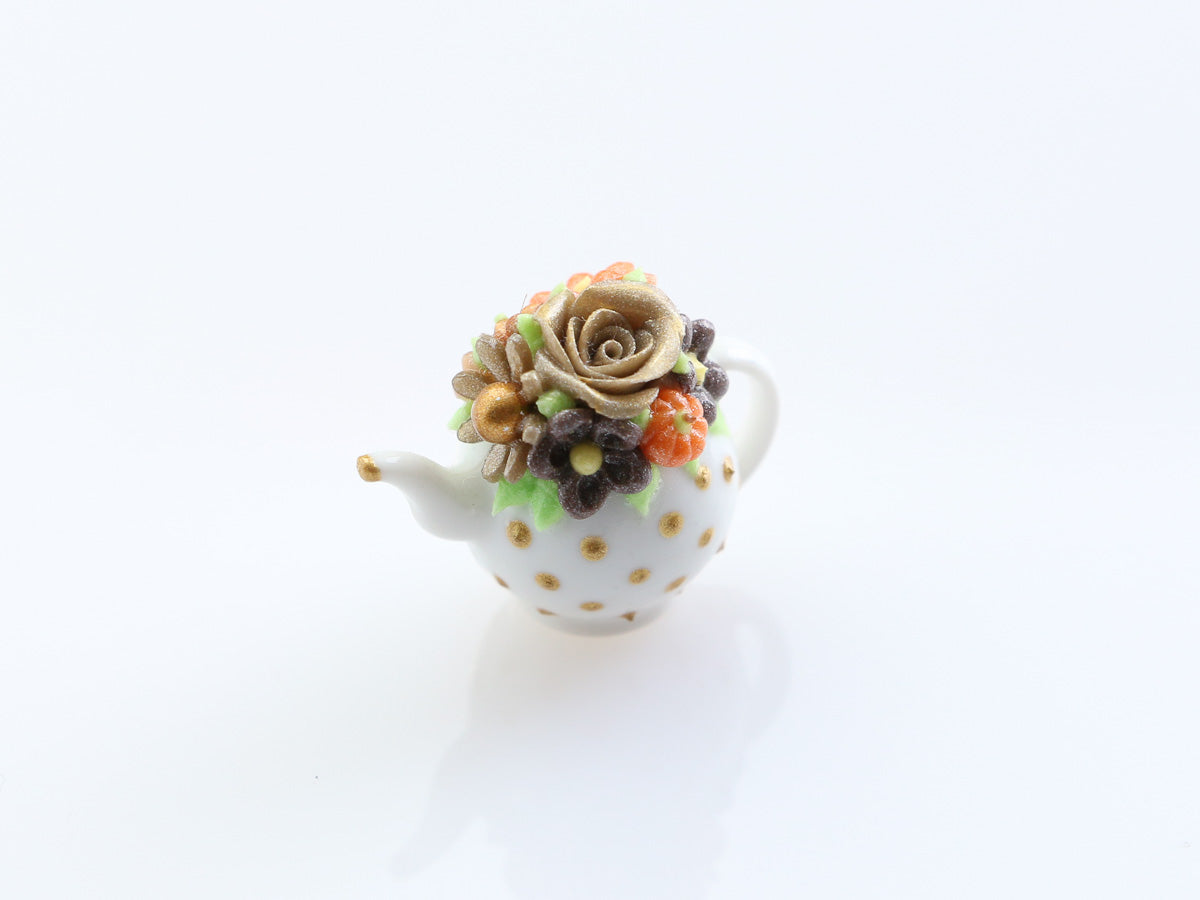 A handmade miniature teapot decorated with orange flowers and pumpkins and polka dots.