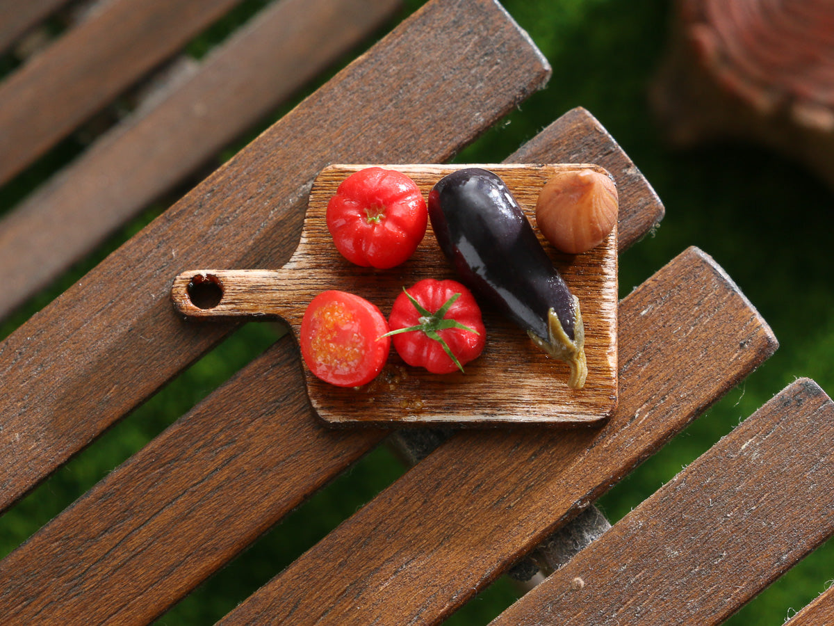 Eggplant, tomatoes and an onion; some of the ingredients for a delicious ratatouille, on a wooden board.