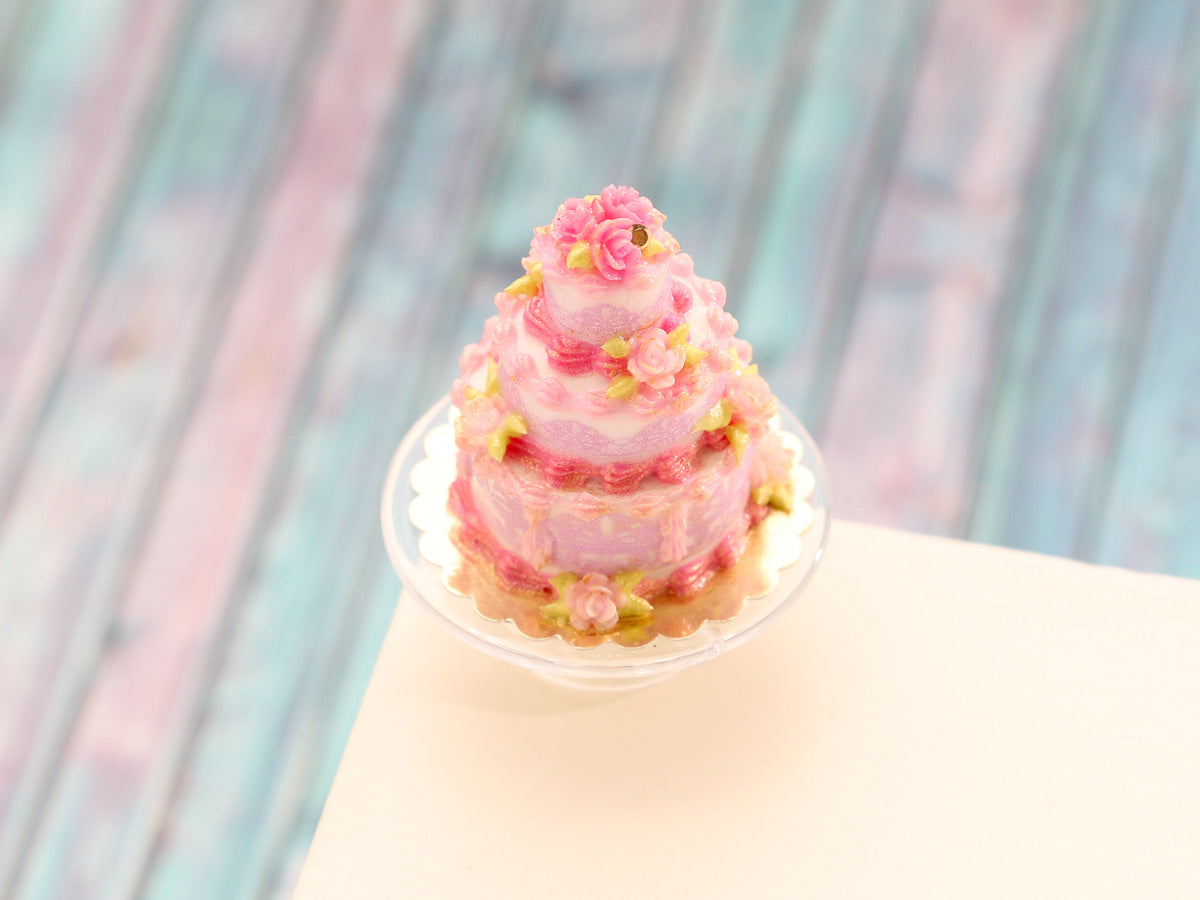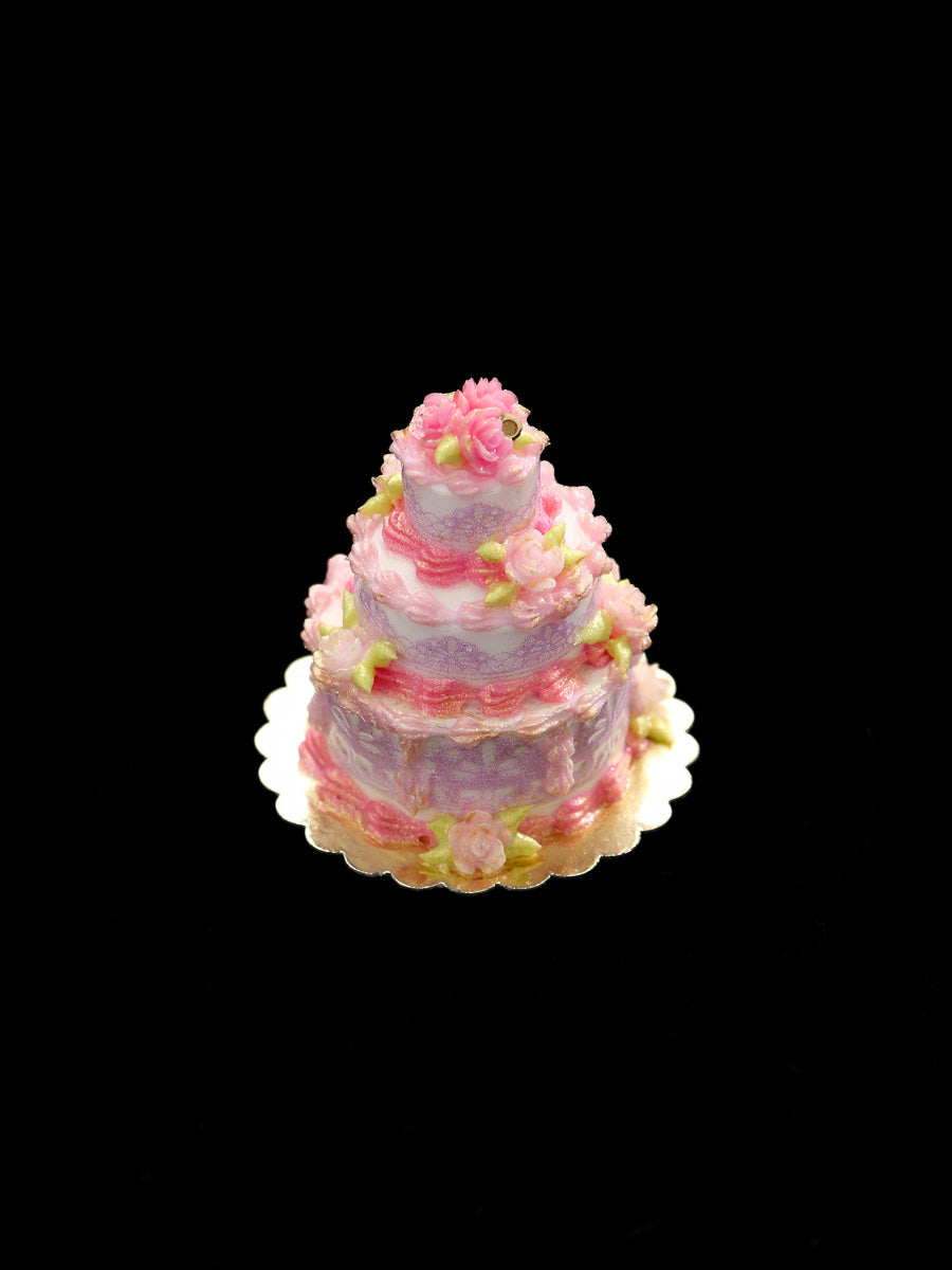 A gorgeous three tiered cake decorated with tiny roses, leaves and hand-piped details with gold accents.