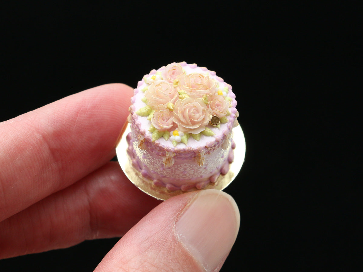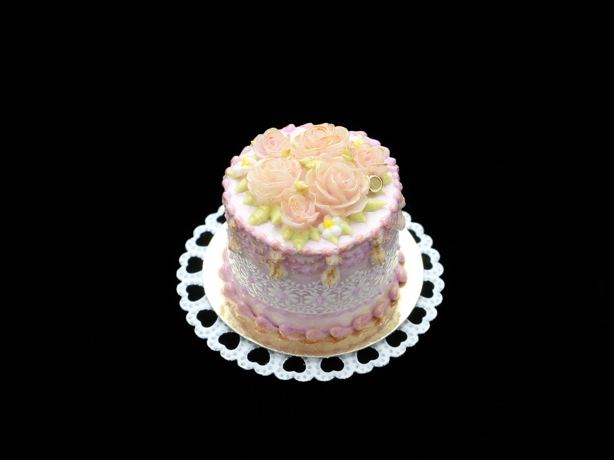 An unapologetically romantic miniature "vintage cake" decorated with meticulously hand-piped details and pink flowers with gold accents.