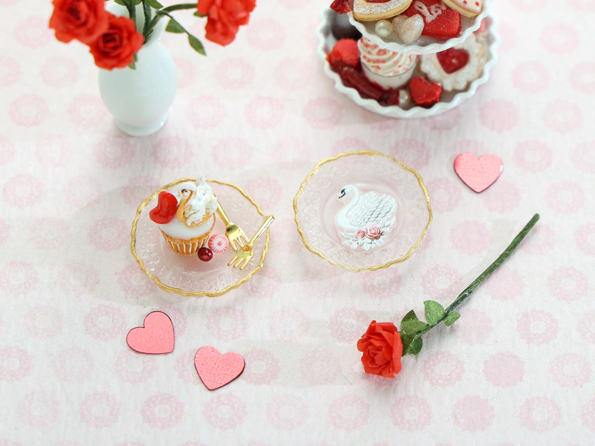 A pair of pretty miniature plates for Valentine's day, one with a dessert and one decorative.