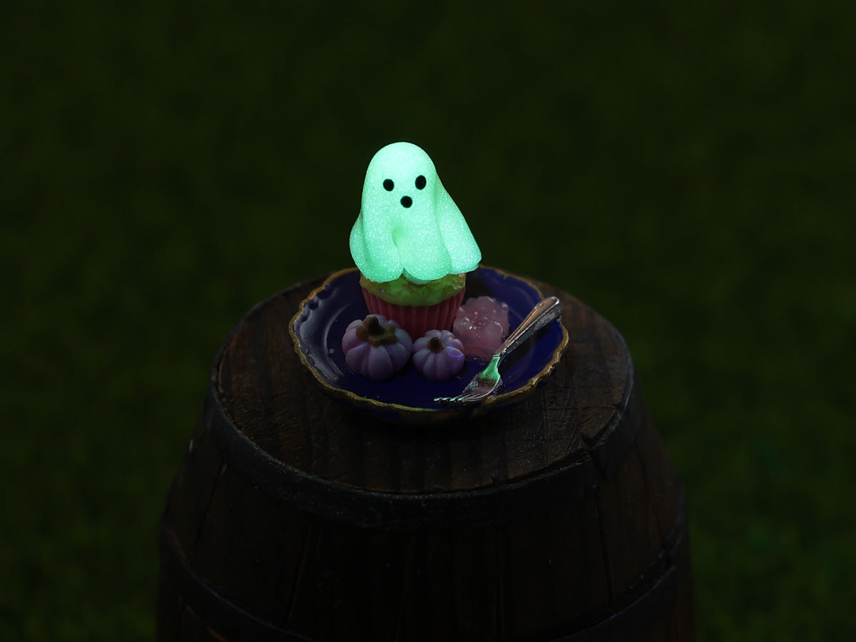 Dessert plate: A glow-in-the-dark ghost cupcake wit gummy bear and pink pumpkins