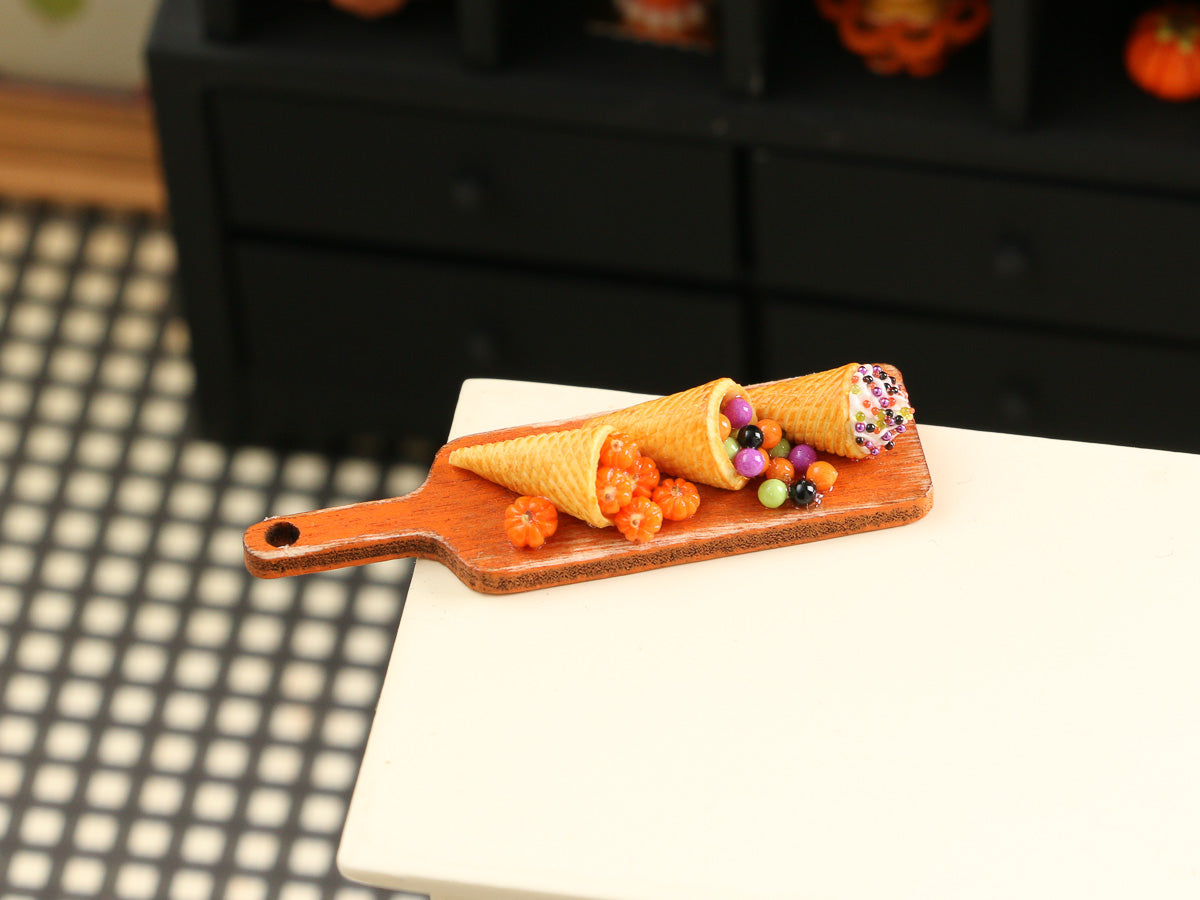A cornucopia of pumpkin candy, another with jelly beans and a cream horn.