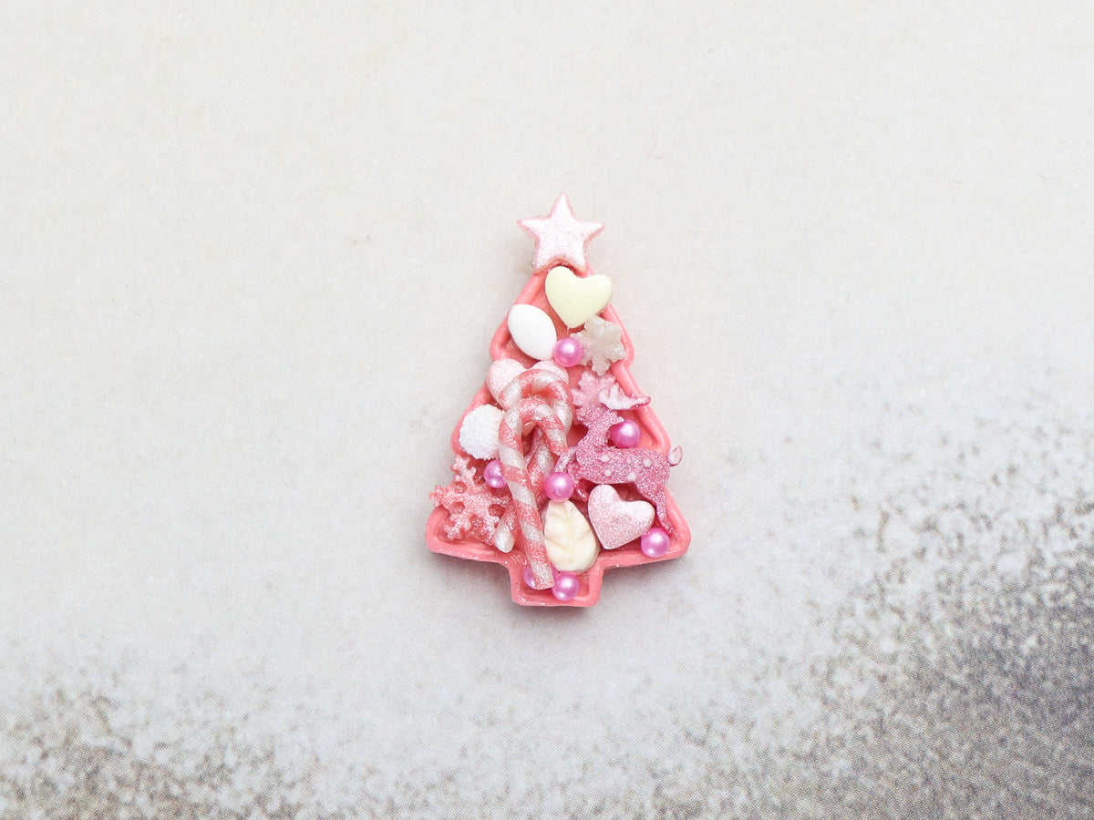A selection of pink Christmas treats served on a tray in the shape of a Christmas tree.