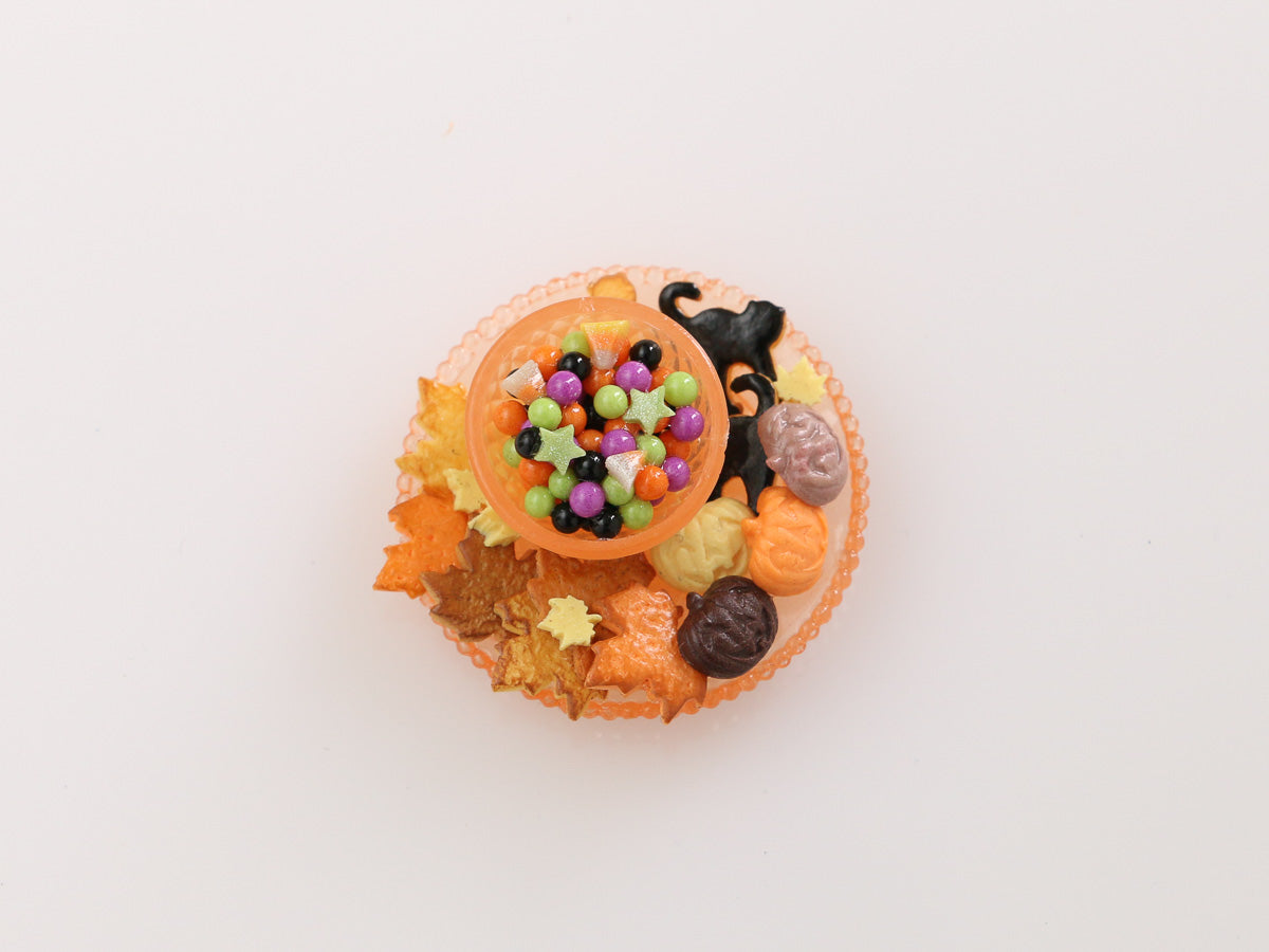 A plate and bowl of halloween goodies for trick or treat, with jelly beans, cat cookies, pumpkin chocolates and more!